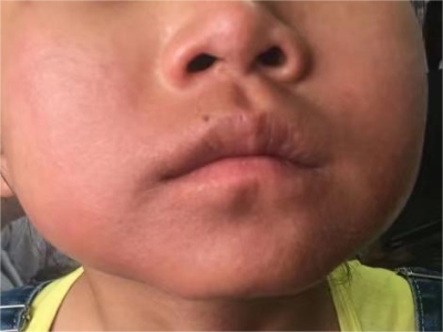 芒果皮炎患者的皮损以嘴巴为中心,向四周不断扩大,初期表现为皮肤发红,微微肿胀凸起,触摸感觉皮温升高,伴有一定的瘙痒感。