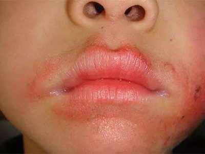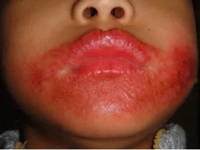 芒果皮炎皮损表现为孩子的嘴巴及周围皮肤潮红、水肿,自觉皮肤有紧绷感、瘙痒感、烧灼感。抓挠后容易引起口唇皮肤破损,出现渗液、结痂等症状。