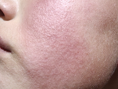 芒果皮炎患者脸上有弥漫性的潮红,并轻微肿胀,与周围皮肤境界清楚,表面粗糙不平,毛孔粗大,有大量的针尖大小的丘疹,附着少许白色鳞屑。