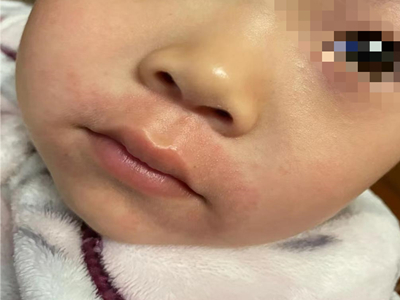芒果皮炎患儿左侧脸颊有一大片皮肤发红,伴有轻微的肿胀,表面有一层密集的小疹子,患儿会感觉局部瘙痒剧烈,需要遵医嘱使用抗组胺药物进行止痒治疗。