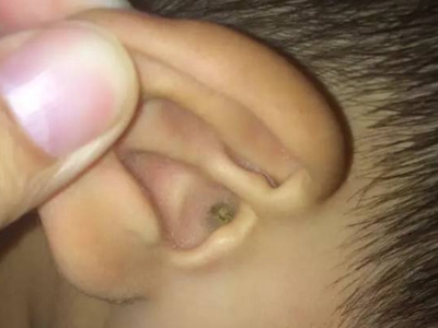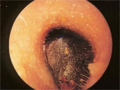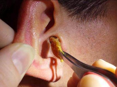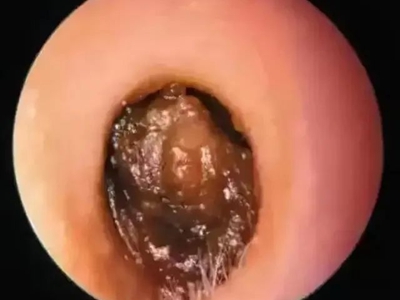 耵聍栓塞临床表现为外耳道内耳屎分泌过多无法排出,耳屎为黑色硬块,表面干燥并堆积成团,完全堵塞外耳道,患者自觉耳中胀闷感,听力减退。