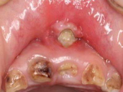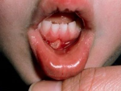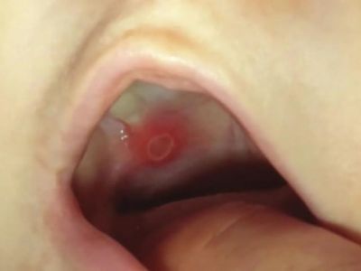 创伤性溃疡在上唇和牙龈的交界处有一块溃疡,黏膜好像烂掉一样,表面呈灰白色,疼痛不明显,但炎性浸润的红色创面面积较大,乳牙牙根外露刺激根尖黏膜形成溃疡,若治疗后痊愈,建议拔除乳牙残根。