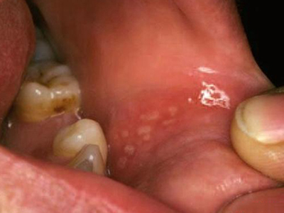 创伤性溃疡口腔内颊侧有白色溃疡图