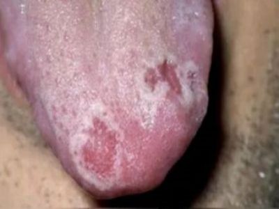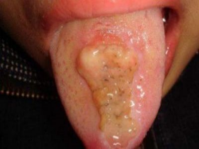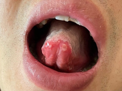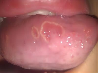 创伤性溃疡病变部位在舌尖,舌黏膜受损后出现两个灰白色的溃疡,近似圆形,与周围皮肤边界清楚,绿豆至黄豆大小,大的溃疡表面有少量褐色的小点点。