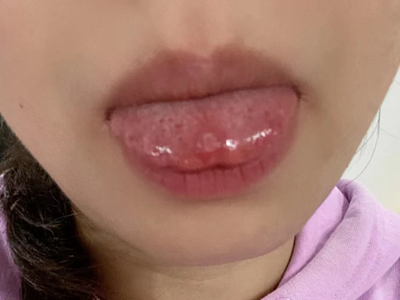 创伤性溃疡患者的咀嚼速度较快,或爱吃太烫的食物,导致口腔黏膜受损,患者舌头上出现两个有白边的红斑,一大一小,进食有强烈刺痛感。