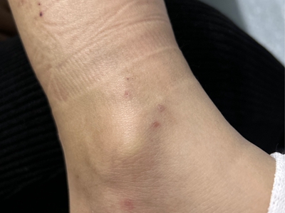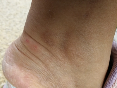 成人痒疹好发于脚踝处,皮损为数个大小不等的扁平疙瘩,颜色为红色,略微高出正常的皮肤表面,颜色为红色,为新生的皮损,同时有几个褐色的斑片,为原有皮损痊愈后留有的色素沉着。