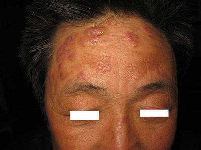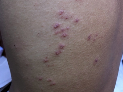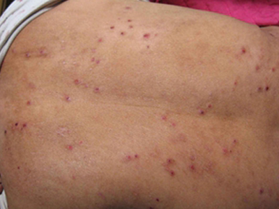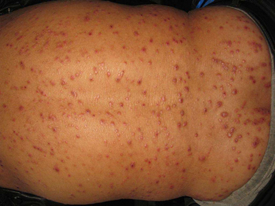 基本皮损为小米至绿豆大小、淡红或肤色、多发性坚实圆形或顶部略扁平的丘疹,散在分布,亦可聚集成簇,但不融合。患者自觉瘙痒剧烈,抓后出现风团样皮损及丘疱疹,反复搔抓可出现苔藓样变、色素沉着。