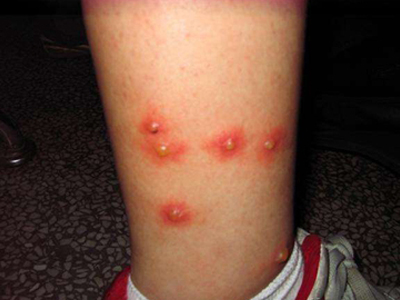 成人痒疹小腿有红色疙瘩中间有水疱图