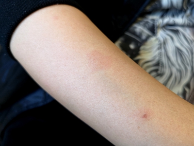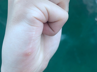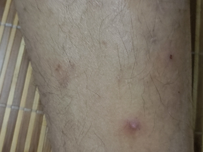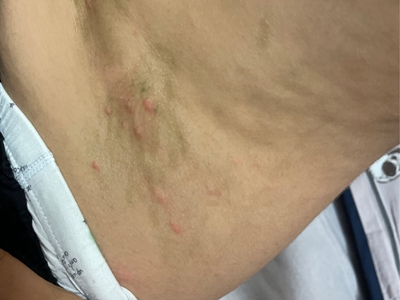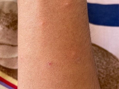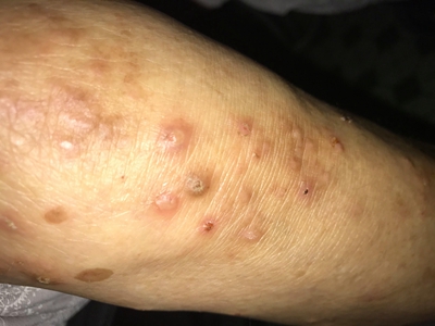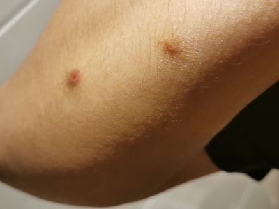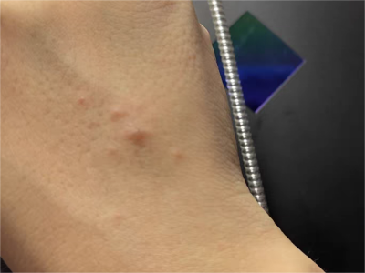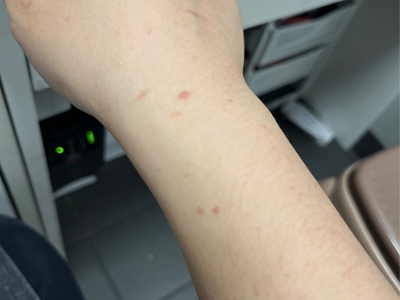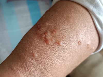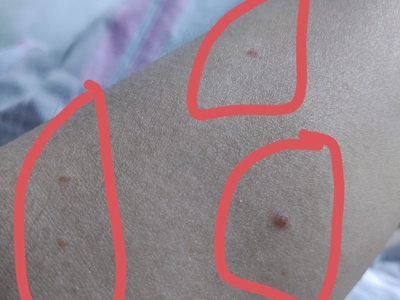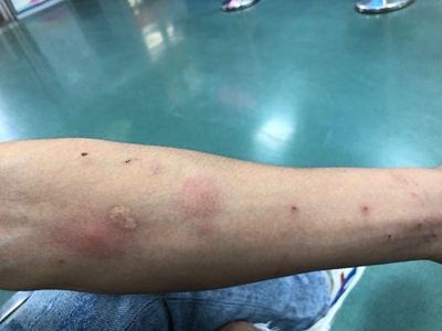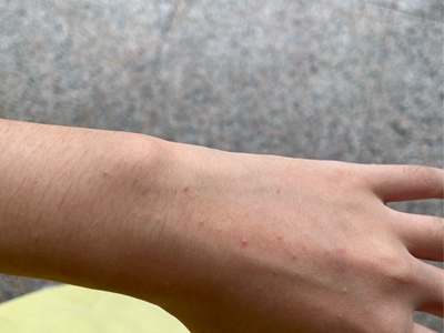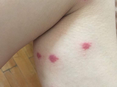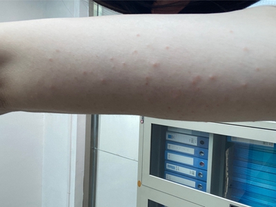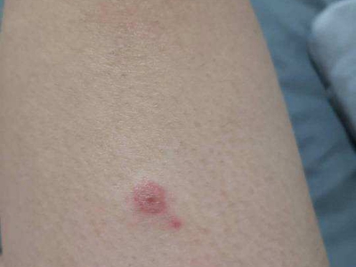 成人痒疹在胳膊上较常见,观察到局部有两处皮损,为绿豆大小的坚实丘疹,呈圆形,同时其顶端破溃,颜色发红,而周围有色素沉着斑,多由于痒疹瘙痒感很强烈导致频繁抓挠所致。