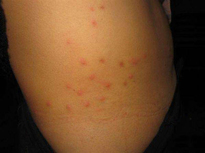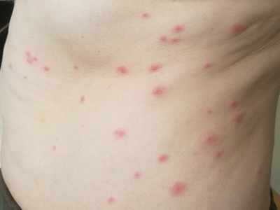 成人痒疹较常出现在腹部,皮损为米粒至绿豆大小的小红疙瘩,其质地较为坚实,呈半球形隆起,伴有明显的瘙痒感,患者抓挠后局部可因受损而留有皮肤色素沉着。
