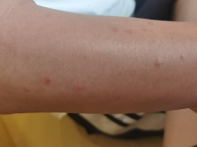 成人痒疹典型症状为患者胳膊上出现小米到大米大小的红点,零散分布且不融合,还有几个褐色斑片,由于皮损有瘙痒感,应尽量避免抓挠,防止其留下瘢痕和色素沉着,可遵医嘱使用炉甘石洗剂缓解。