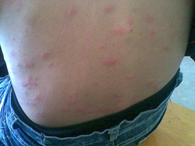 成人痒疹患者的背部长几个红色的疙瘩,疙瘩呈黄豆大小,边缘有明显的红晕,且红晕面积较大,微微凸起。患者伴随明显的痒感,在搔抓后可以缓解。