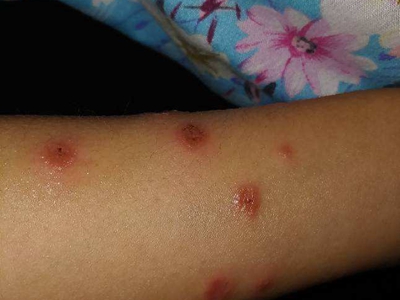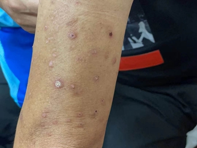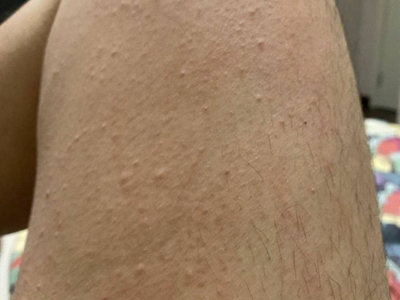 痒疹患者胳膊上有多个疙瘩,会突出于皮肤表面,相邻的疙瘩可以相互融合,形成较大结节,顶端破溃后有褐色痂皮形成,患者会有明显瘙痒感。