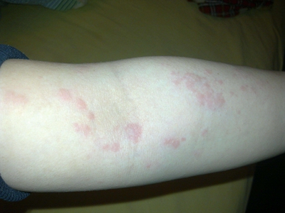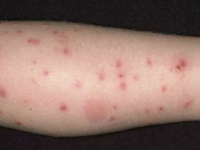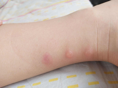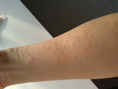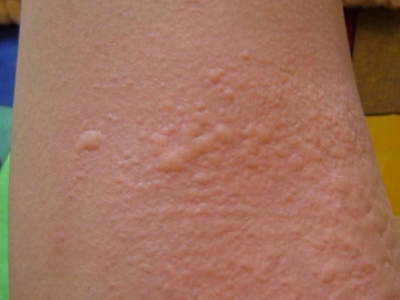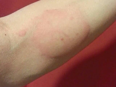 成人痒疹患者的胳膊上时,皮肤表面会出现淡红色的疙瘩。疙瘩形状不规则,大小不一,不同的疙瘩之间可以相互融合,进而出现更大的疙瘩。