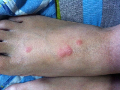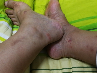 成人痒疹患者的脚背出现红色的疙瘩,疙瘩突出皮肤表面,呈粉红色、暗红色,相邻的疙瘩融合成更大的疙瘩,患者会有较为明显的瘙痒。