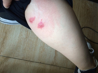 成人痒疹患者小腿皮肤上有红色疙瘩,其中央有一凸起的水疱,破损后可流出红色的组织液。同时疙瘩会有明显的瘙痒感,所以会出现搔抓现象。