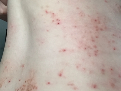 成人痒疹的患者在后背上出现数个独立存在的丘疹,颜色为暗红色,质地坚硬。由于皮损瘙痒剧烈可导致患者反复抓挠,引起皮肤表面破损、结痂,同时有顶端发白的脓性丘疹存在,建议避免搔抓刺激。