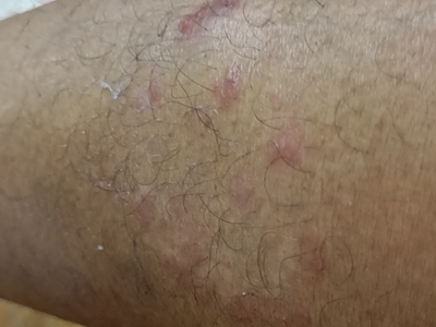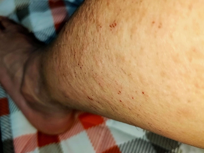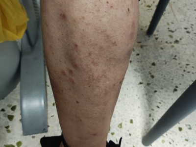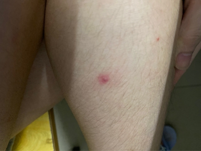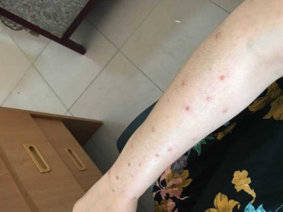 成人痒疹患者小腿部位出现数量较多的红色小疙瘩,表面有水疱,边缘有红晕,在水疱破裂后,表面会形成黄色或暗红色的痂以及白色的死皮。