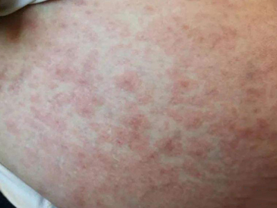 成人痒疹患者的腹部有密密麻麻的红斑,斑的颜色深浅不一,有淡红色、暗红色等,部分红斑之间相互融合形成更大的红斑,边界不清。