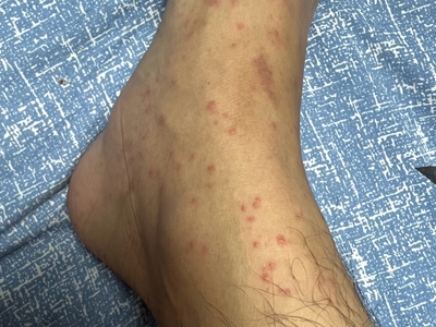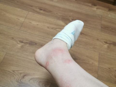 成人痒疹患者脚踝上有几个颜色深浅不一、形状大小也不一样的红斑,通常患者会自觉瘙痒症状明显,可遵医嘱使用氯雷他定等抗组胺药物进行治疗。
