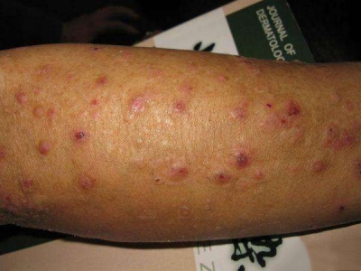 成人发病于胳膊时会出现许多米粒至绿豆大小的丘疹,像小疙瘩一样,皮肤呈淡红色改变,密集分布但是没有相互融合,痊愈后容易复发。