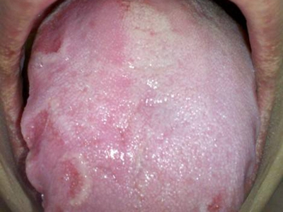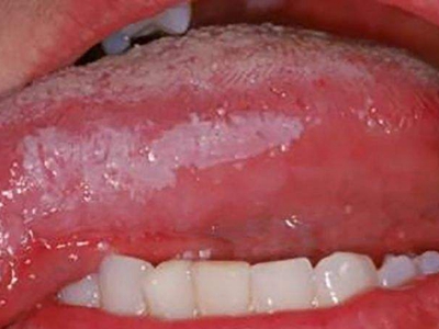 口腔毛状黏膜白斑累及患者舌头,导致局部出现白色黏膜改变,呈片状,稍高于舌部。部分患者无自觉症状,或只出现轻微疼痛的症状。