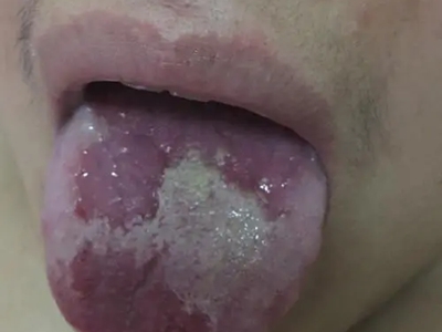 口腔毛状黏膜白斑舌头上有白色斑块,几乎覆盖整个舌面,但边界不清晰,其上有少量褶皱,部分表面呈毛绒样,一般不伴有不适症状。
