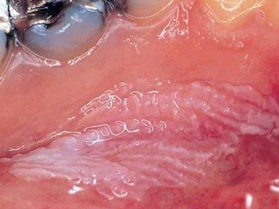 口腔毛状黏膜白斑患者的牙龈出现白斑,皮损表现为点圈状的不规则小面积分布,直径1mm左右,患者无明显自觉症状,需及时治疗,避免扩散。