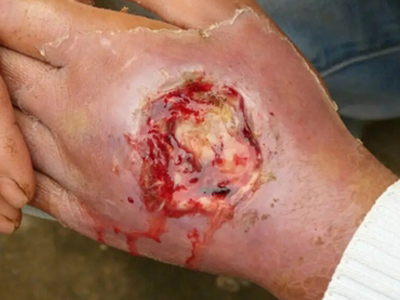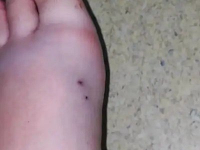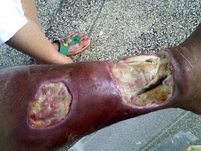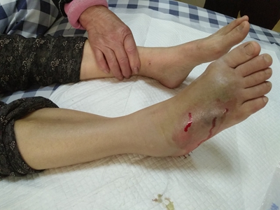 咬伤局部可见两颗较大,呈“..” 形或“::”形的咬痕,毒蛇体形越大,牙距越宽。神经毒局部症状可不明显,无红肿痛或起初有轻微疼痛和肿胀,不久就会出现麻木,牙痕小且不渗液。血液毒局部肿胀、疼痛,轻者血自牙痕或伤口处流出难以凝固,重者伤口流血不止。细胞毒作用的局部表现有剧痛、红肿、水疱、坏死及溃烂。