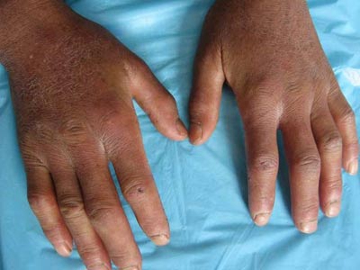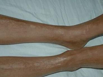 局限性硬皮病主要累及皮肤,一般无内脏受累,主要表现为皮肤变硬、萎缩。斑块状硬皮病在躯干多见,初为一个或数个淡红或紫红色水肿性斑片,椭圆或不规则形,钱币大小或更大,数周或数个月后皮损扩大,中央逐渐凹陷,呈象牙或黄白色,周围绕以淡红或淡紫色晕,触之似皮革,久之皮损表面光滑、干燥、无汗、毳毛消失,数年后停止扩展,硬度减轻,局部萎缩变薄,留有色素沉着或减退。