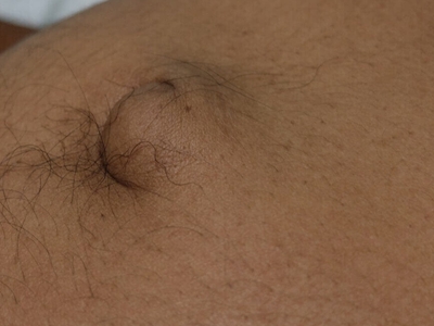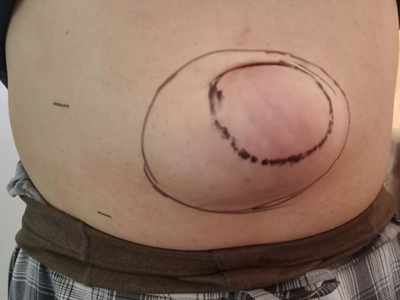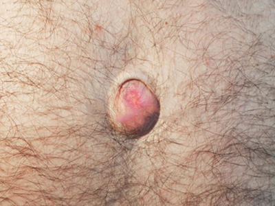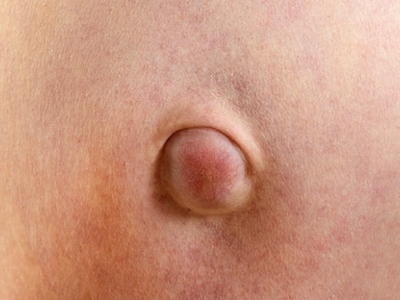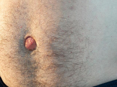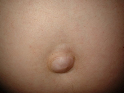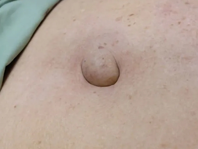 成人脐疝患者在站立、咳嗽和用力时脐部会有半球形包块,鹌鹑蛋大小,呈肤色。平卧时可消失,肿物回纳后可触摸到腹部缺损,不能自愈,易发生嵌顿或绞窄。