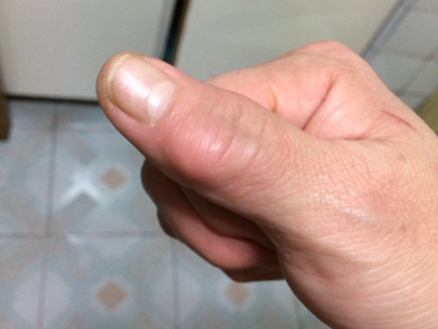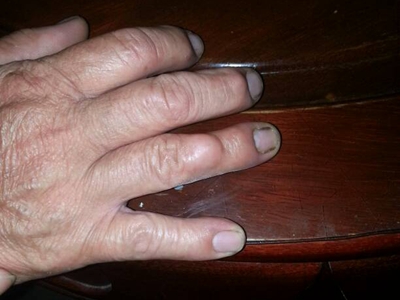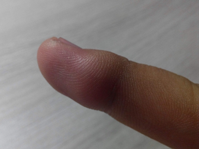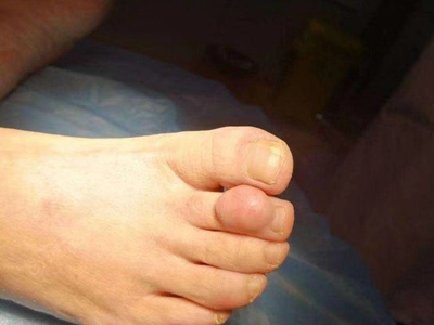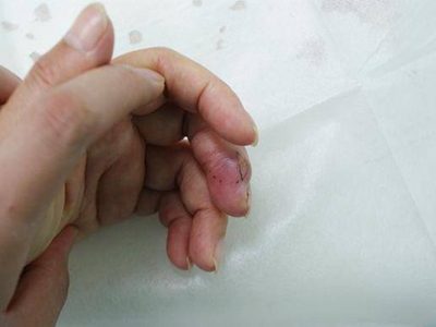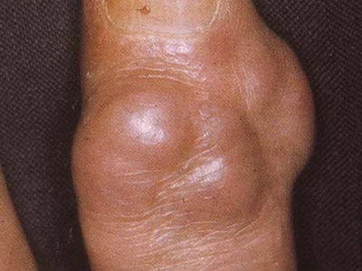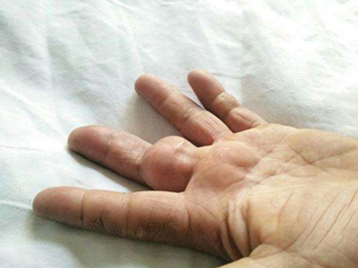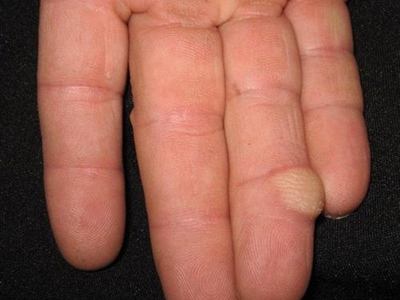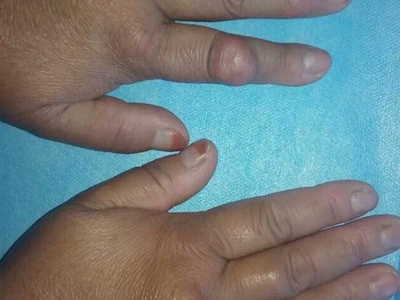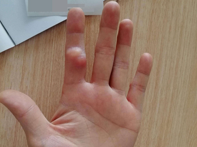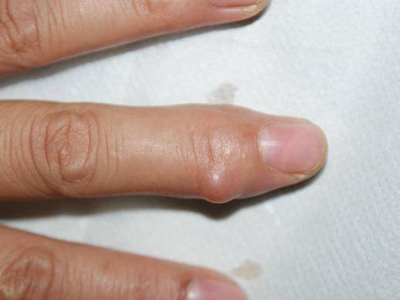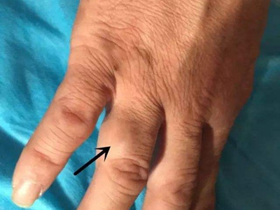 腱鞘巨细胞瘤患者左手食指第二指关节外侧有一个异常增大的小结节,表面略微凹陷且有深色小点,结节周围皮肤颜色相对较红,但患者并没有不适感。