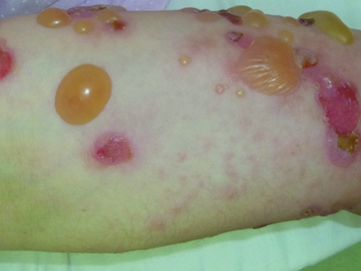 家族性良性慢性天疱疮患者的手臂出现大量大小不等的水疱,色黄,疱液早期清亮,之后逐渐混浊,水疱破裂后形成的粉红色糜烂面,伴有恶臭味。