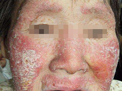 家族性良性慢性天疱疮患者面部出现大片红斑,形状不规则,边界较清晰,红斑表面附着较多的干皮,伴有疼痛、瘙痒等不适症状。