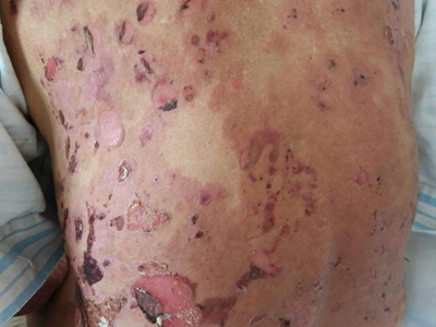 家族性良性慢性天疱疮患者的背部以及腰间的大量水疱已经出现破溃,糜烂面呈粉红色,逐渐结痂,呈深褐色,部分糜烂面上见少量鳞屑。
