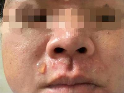 家族性良性慢性天疱疮患者口周长了个水疱,黄豆大小,疱皮紧张、光亮,疱液清澈,唇上方皮肤有少量干皮,患者自觉患处有瘙痒感。