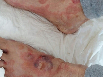 家族性良性慢性天疱疮造成双脚皮肤有大量红斑,部分红斑融合,红斑上起1-3cm的大水疱,部分水疱已经破裂,形成干燥的褐色痂皮,并散发腥臭味。