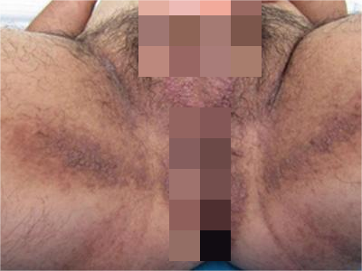 家族性良性慢性天疱疮患者大腿内侧根部有红斑,红斑基础上糜烂、结痂,有腥臭味,数月后逐渐愈合,不留瘢痕,存在色素沉着,无全身症状。