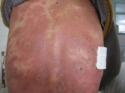 家族性良性慢性天疱疮患者的背部存在大量圆形或类圆形、绿豆至花生粒大小的红斑,边界清楚,部分红斑表面附有褐色血痂,有疼痛、瘙痒等症状。