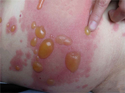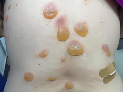 家族性良性慢性天疱疮患者背部长了许多水疱,疱壁紧张,疱液较为清亮,部分水疱已经破裂,局部形成红斑以及散在的结痂,经过积极治疗,能够明显改善症状。