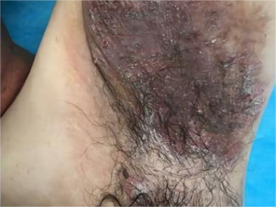 家族性良性慢性天疱疮患者腋下皮肤发黑,局部皮损反复发作,形成颗粒状赘生物,自觉瘙痒、疼痛,有腥臭味,数月后皮损逐渐消失,但留有色素沉着。