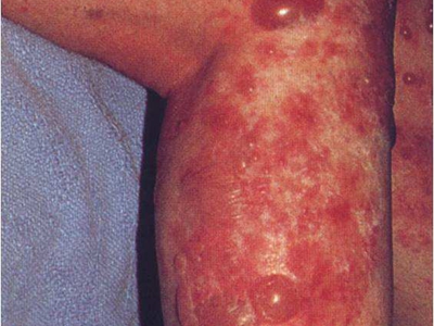 家族性良性慢性天疱疮患者胳膊出现大片表皮松解,局部水疱破裂后形成粉红色糜烂面,以及出现少量结痂。建议遵医嘱全身使用抗生素治疗,局部使用糖皮质激素治疗。
