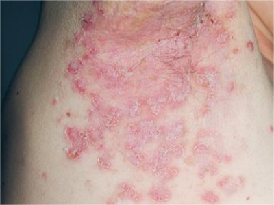 家族性良性慢性天疱疮通常在20-30岁发病,好发于对称性间擦部位,如颈项、腋窝和腹股沟,少数发生在肛周、乳房下、肘窝和躯干。皮损常表现为红斑基础上松弛性水疱,疱壁薄易破,形成糜烂和结痂,或因反复发作形成颗粒状赘生物,自觉瘙痒、疼痛,有腥臭味。少数患者可有黏膜受累。夏季因日晒、多汗加重,引起活动性疼痛。数月后愈合,不留瘢痕,可留色素沉着,可反复发作,多无全身症状。
