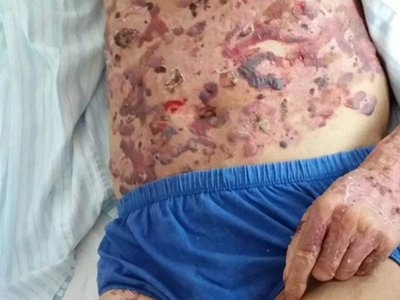 家族性良性慢性天疱疮患者的腹部长了较多大水疱,疱液较为清亮,部分水疱已经破裂,破裂后留下粉红色的糜烂面或结成血痂,自觉瘙痒、疼痛,有腥臭味。