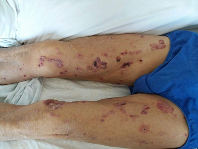 家族性良性慢性天疱疮患者的大腿皮肤上存在许多边界较为清楚的淡红色斑片,淡红斑上的水疱已经破裂,形成烂面,周围或整个糜烂面逐渐干燥结痂。
