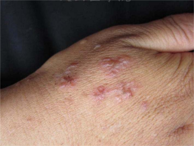家族性良性慢性天疱疮患者的手背长了大小不等的水疱,较小者似绿豆大小,较大者如花生粒大小,疱壁紧张、光亮。水疱破裂,疱液流出后形成黄色或褐色结痂。