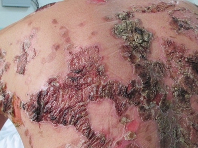 家族性良性慢性天疱疮造成背部出现大量的松弛性水疱,部分已经糜烂,并形成大量结痂,伴有明显腥臭味,建议遵医嘱全身使用抗生素治疗,局部使用皮质类固醇激素治疗。