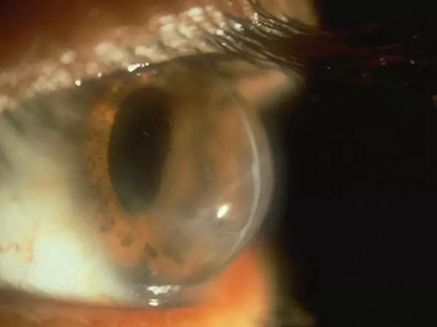 圆锥角膜的患者会出现角膜急性水肿,角膜扩张并且明显鼓起,从侧面观更明显,同时伴随视力明显下降,角膜水肿可消退,消退后遗留中央区角膜混浊。
