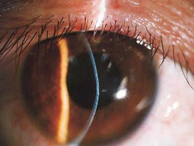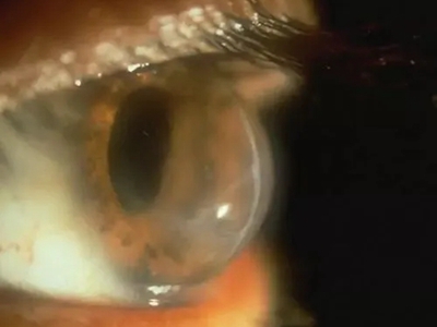 圆锥角膜可肉眼观察到患者眼球凸起,变形呈一个圆锥形,角膜病损中央变薄,侧面看更为明显,进一步发展可导致后弹力层破裂,发生急性圆锥角膜,出现角膜急性水肿。