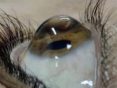 圆锥角膜患者的眼球出现不同程度的变形,变形程度较重时,角膜顶端明显向前突出,患者眼白上有很多红血丝,并伴有不规则散光、高度近视等视力异常。
